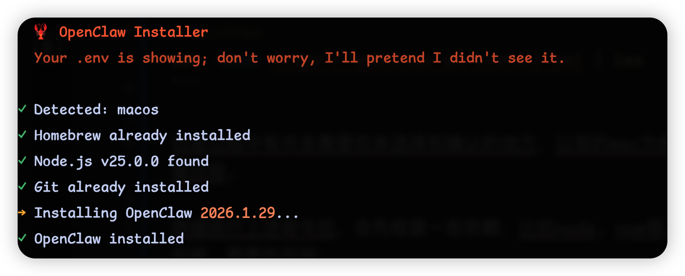 暂时抛开官方这些“深奥”的建议,我们先来尝试安装它,下一篇我们再来安全地把它关到“沙盒”中去。安装 OpenClaw 非常简单,只需要一行命令: