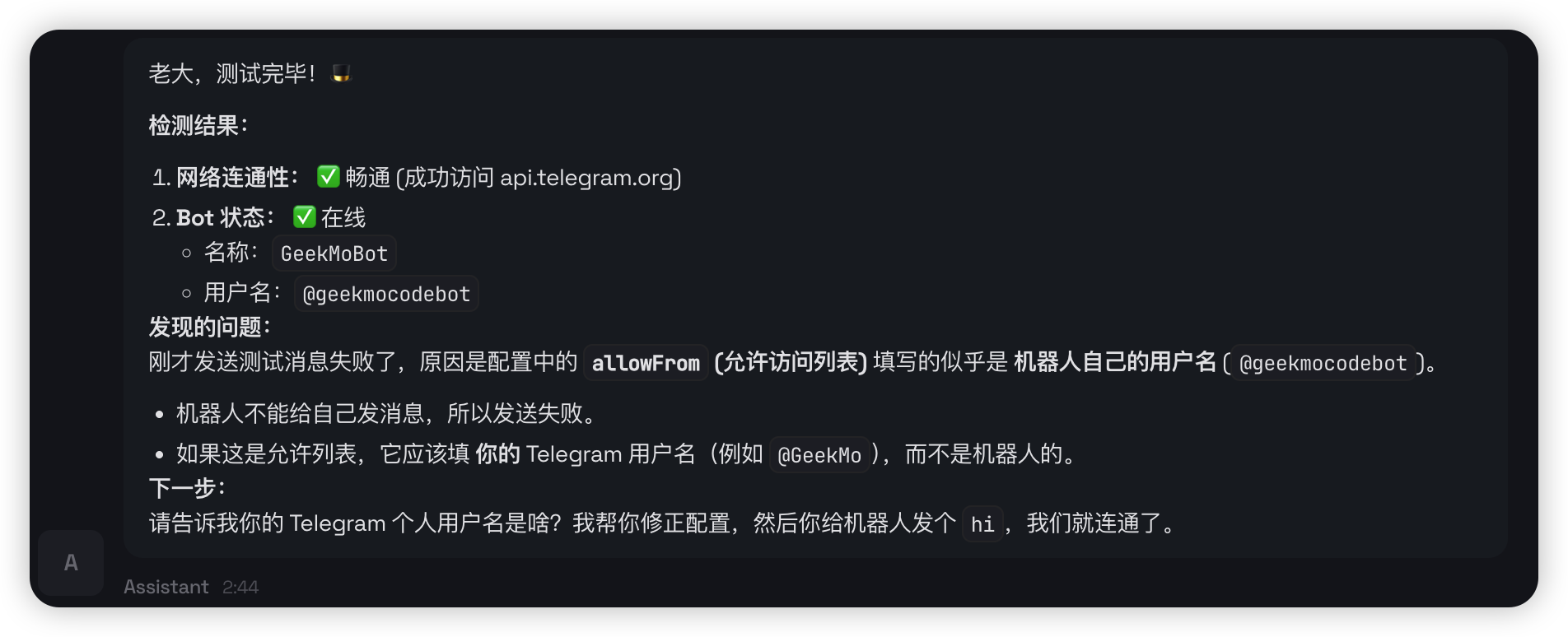 1openclaw pairing approve telegram <code>这里注意一个坑,当你配置好 Telegram,发送任何消息可能没有反应,你需要检查网络是否畅通,是否配置了代理(关键)。这说明 openclaw 没有收到消息,你需要到dashboard检查是否配置成功,并且配置的授权模式是否是